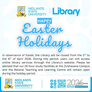 Welcome to the Midlands State University Library, where we are dedicated to supporting the learning and teaching, research, and innovation needs of the University community. With a main library and nine branch libraries across our three campuses, we provide various resources and services to assist our students and staff in achieving their goals.